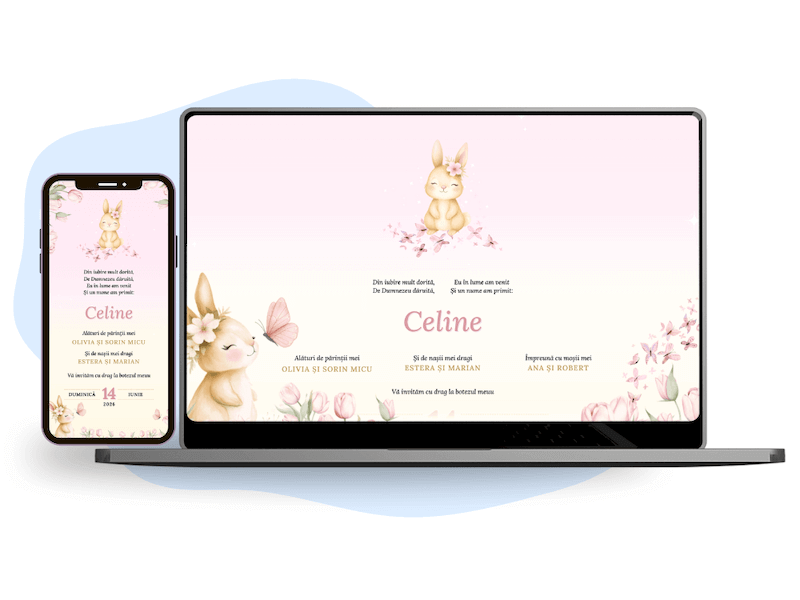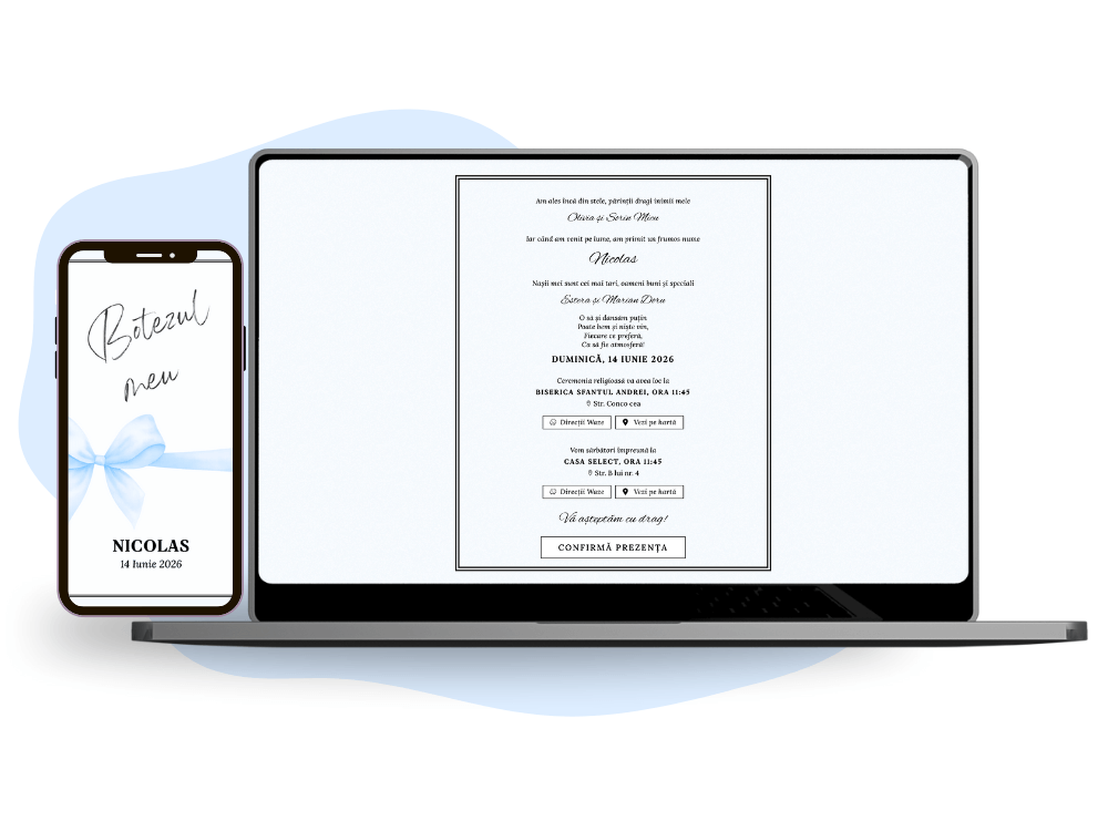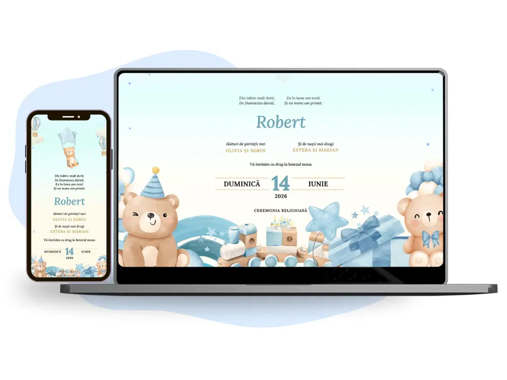 Botezul este un moment plin de semnificație și bucurie în viața oricărei familii. Cu invitațiile noastre online poți să aduci un plus de eleganță și emoție acestui eveniment special. Invită oamenii dragi să celebreze începutul unui nou capitol alături de tine.