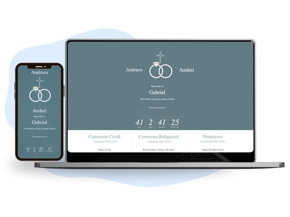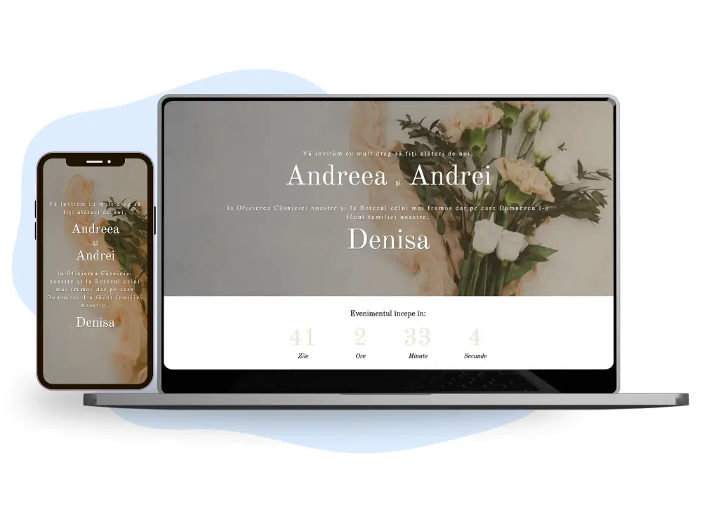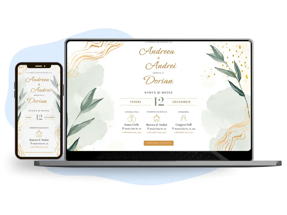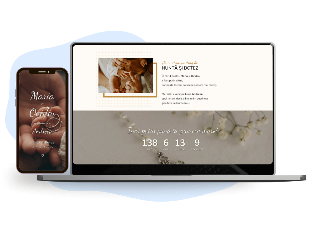 Special create pentru evenimente combinate de nuntă și botez, invitație online vainvit.ro îmbină tradiția și modernitatea, oferindu-le invitaților tăi toate informațiile de care au nevoie într-un format elegant și ușor de accesat. Celebrează iubirea și viața într-un cadru unic, înconjurat de cei dragi, și transformă aceste două evenimente speciale într-o amintire de neuitat.