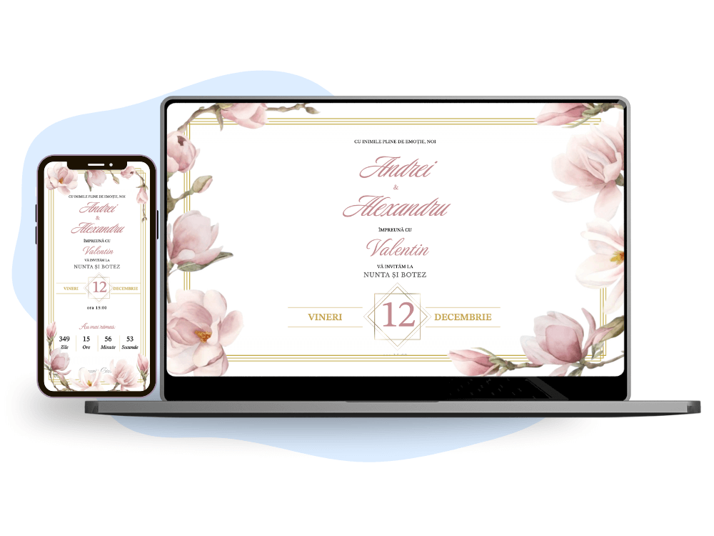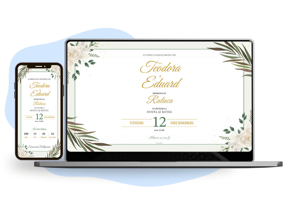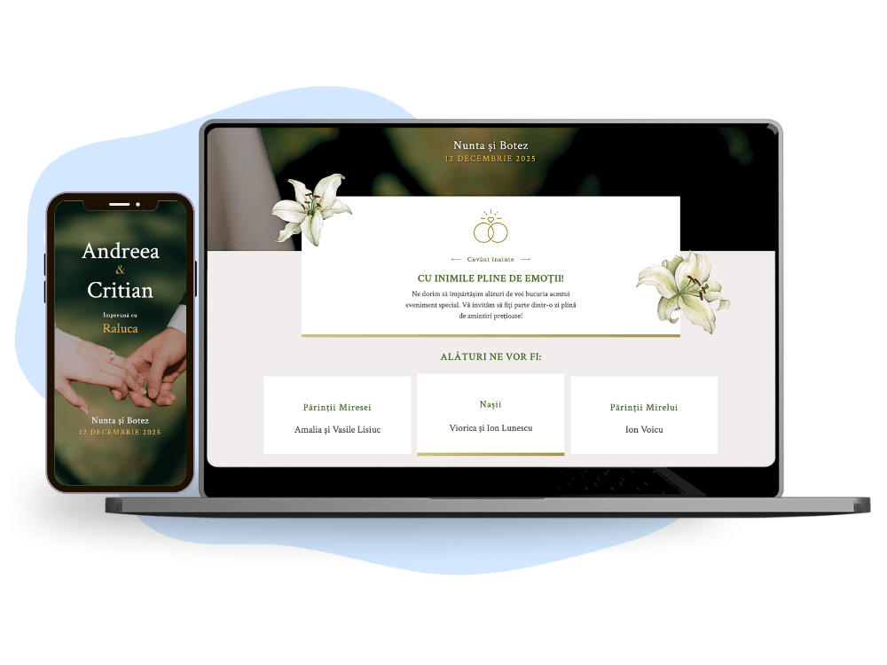 Nunta și botezul reprezintă două momente unice în viață, pline de iubire, emoție și bucurie, care merită să fie împărtășite alături de cei dragi. Cu invitațiile online de tip 2 în 1 – nuntă și botez – aduci o notă de eleganță și entuziasm acestor momente de neuitat. Invită-ți familia și prietenii să fie martori la celebrarea iubirii și la binecuvântarea noului membru al familiei într-o zi memorabilă, fie că organizezi o ceremonie restrânsă sau o petrecere de amploare.